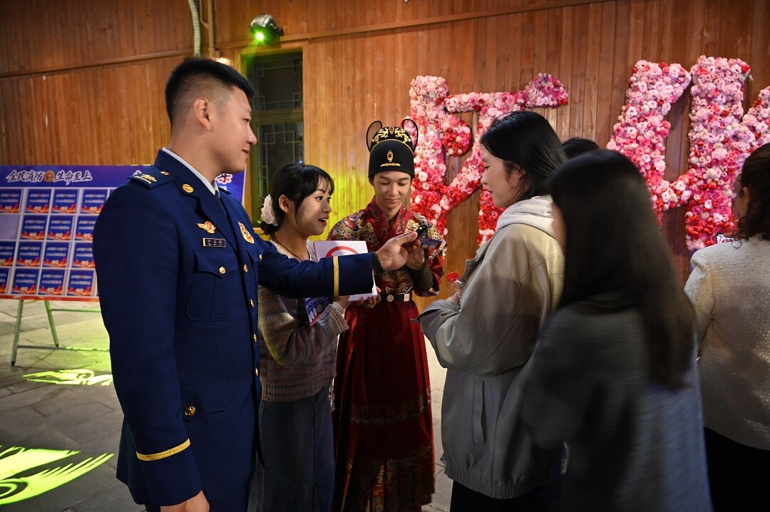在互动体验环节中,消防隐患“狙击手”、消防勇士“集结号”、火场“迷宫”大逃亡三大实操任务,与消防谜语猜猜猜、消防知识不会忘、消防安全“大富翁”三款趣味小游戏轮番上演。现场群众通过“体验集章”“抽奖”等形式,赢取消防主题钥匙扣、帆布袋、消防小熊等消防文创周边;线上观众则通过弹幕参与隐患找茬、知识答题、话题留言,营造了“线上线下齐互动、安全知识共学习”的良好氛围。