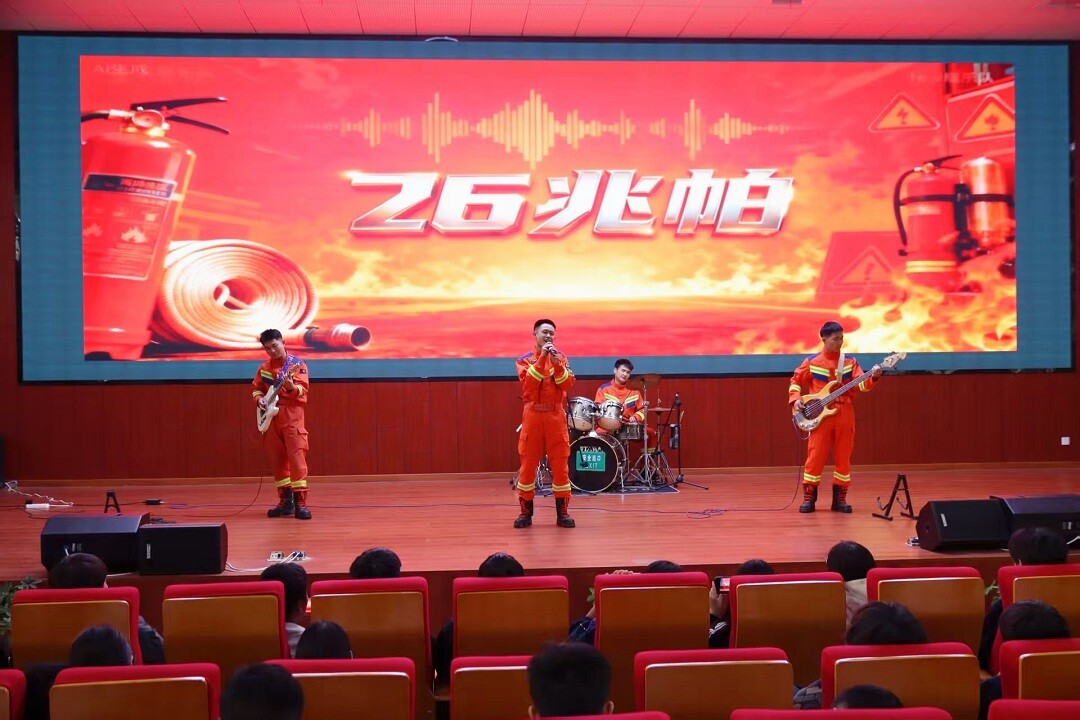 舞台上,四位身着橙色救援服的消防员帅气亮相。吉他弹唱深情款款,架子鼓独奏激昂澎湃,原本枯燥的消防知识,在动人旋律中“声”入人心。台下师生随着节奏挥舞手臂、齐声跟唱,现场气氛热烈,掌声不断。